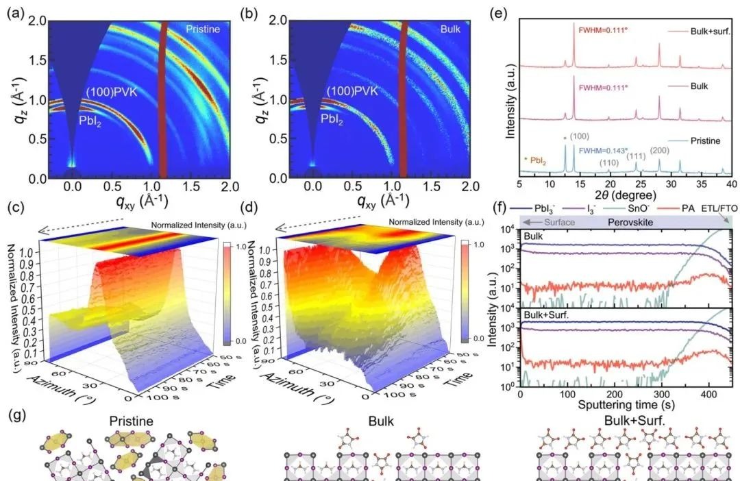 金属卤化物钙钛矿因其优异的光电性能和低成本的制造技术而成为有前景的光伏材料。然而,钙钛矿太阳能电池(PSC)的性能和稳定性受到光学活性相晶体的随机取向和体/界面缺陷的显著影响。为此,High漫画 新型电力系统研究中心、电机系易陈谊课题组开发了一种多功能有机材料仲班酸(PA),用于调节结晶,形成了具有集中面外空间取向的钙钛矿薄膜;同时利用PA进行界面处理,实现了对钙钛矿太阳能电池体相和界面缺陷的协....