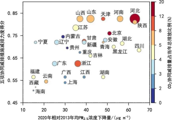 污染控制政策更严格的省份也实现了更显著的PM2.5浓度下降和碳协同减排。河北、山东、浙江、山西和河南为碳协同减排量最大的五个省份,2020年协同减排量占本地总碳排放量的5.9%~13.2%,说明清洁空气行动是实现这些省份碳减排的重要驱动因素。