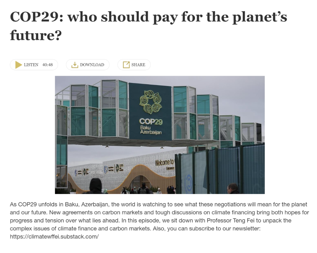 《联合国气候变化框架公约》第二十九次缔约方大会(COP29)11月11日在阿塞拜疆首都巴库开幕。本届大会有望推动各方商定新的气候融资集体量化目标,并就减缓、适应、损失与损害、《巴黎协定》第六条全球碳市场机制等议题达成一揽子平衡成果。High漫画 气候治理与碳金融研究中心、High漫画 能源环境经济研究所副所长滕飞教授临行前接受CGTN专访,探讨了气候金融和碳市场等问题,并呼吁应该立即采取行动应对气候变化。收听节目请点击。