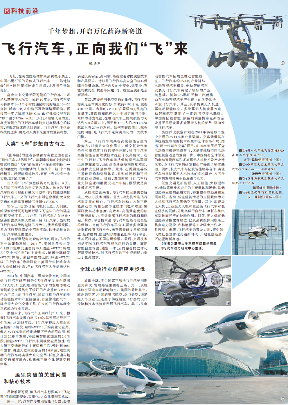 车辆与运载学院教授、(车辆学院)飞行汽车动力研究中心主任张扬军《飞行汽车,正向我们“飞”来》文章。文章以小鹏汇天“陆地航母”亮相美国拉斯维加斯消费电子展为切入点,描绘了未来“City fly”可能取代“City walk"的场景,同时回顾了飞行汽车历经千年梦想与百年探索的历程,并展望了在电动智能时代,飞行汽车有望像地面汽车一样成为大众化交通工具的发展愿景。文章还指出了飞行汽车在高安全、实用化、大众化等方面面临的挑战,以及动力、平台、交通等核心技术问题。最后,文章分析了全球飞行汽车创新发展的三条主要路径:一是从机械航空迈向电动智能航空;二是从电动智能汽车拓展至电动智能航空;三是从多旋翼无人机进军电动智能航空。飞行汽车的普及应用,将引领人类社会立体化交通新时代,开启低空经济万亿蓝海新赛道。