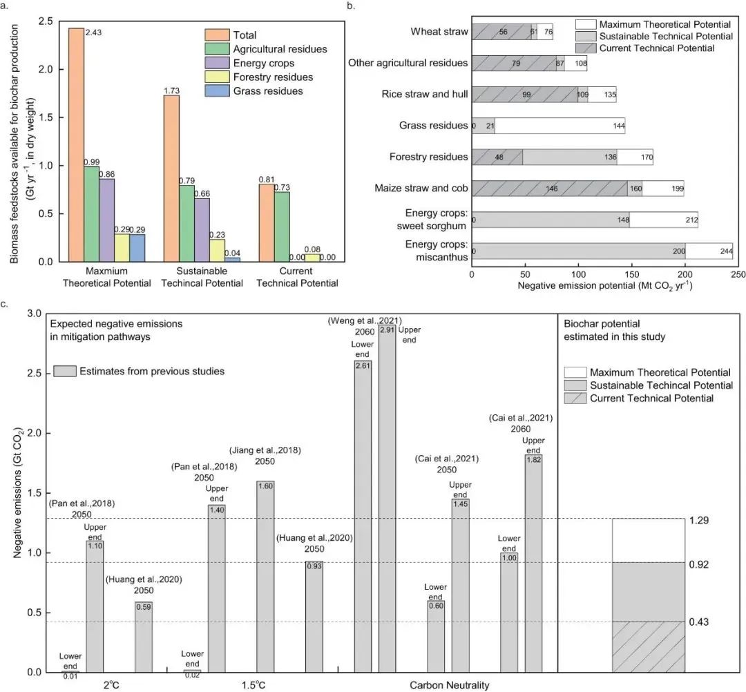 图1.中国可用的生物质原料及生物炭负排放潜力