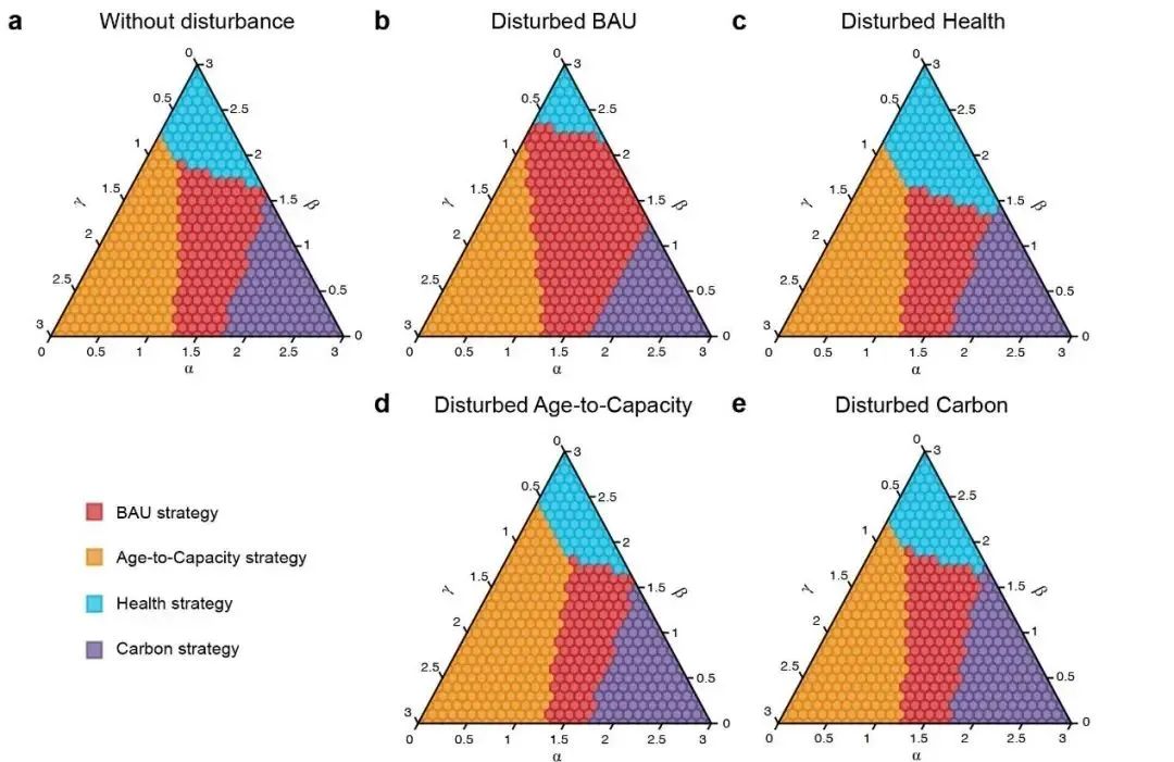 研究进一步从煤电机组的异质性特征出发,从资产搁浅、碳减排、健康效益的多目标视角分析燃煤机组退役路径的差异性;通过开展万组退役路径的扰动模拟分析,发现不确定性可能延误退役政策首次获得正效益的时间节点,沿用当前的退役策略可能导致获得正效益的时间延迟六年(图1);任一退役政策的实施均存在一定程度的风险,并非所有策略都能保证100%累积净效益,特别是以碳减排、资产搁浅规避为首要目标的靶向退役策略和沿用当前的退役策略均有一定概率导致累积负效应。在政策执行不确定性的干扰下,即使严格根据政策目标设计煤电退役策略,仍有可能错过落实最适宜退役政策的机会(图2)。研究表明,煤电退役应最大限度地减少政策执行干扰,降低负效应风险,同时按照靶向政策目标选取最适策略指导我国煤电机组有序低碳转型。