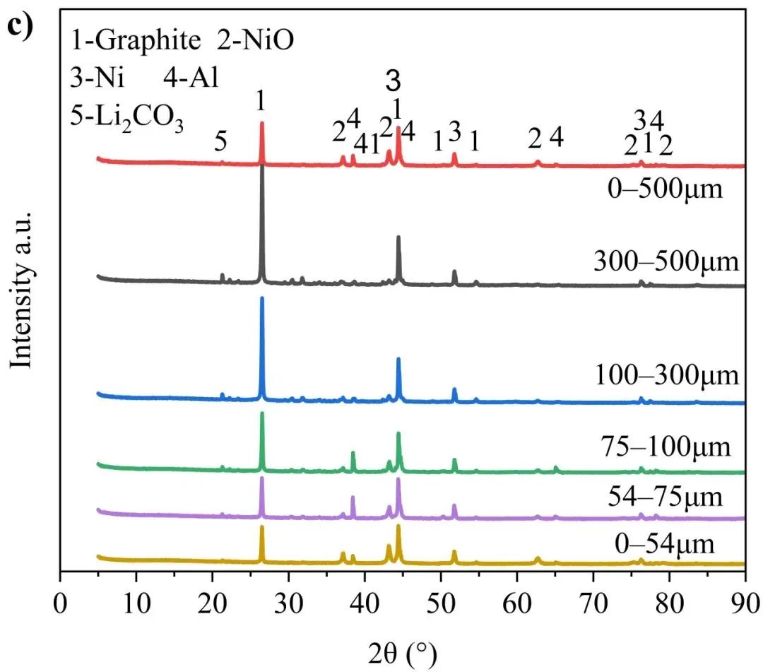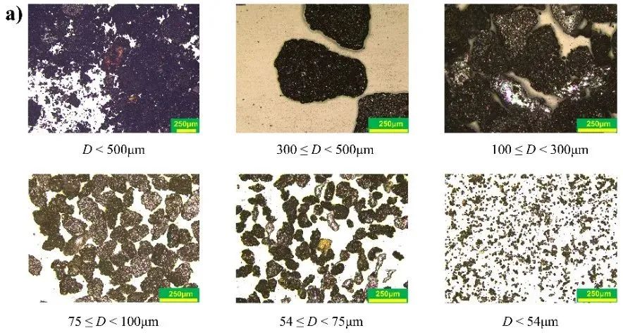 在本研究选取的颗粒物中,通过500μm筛网的颗粒物质量占比超过90%,因此以这部分颗粒物作为主要研究对象。采用不同孔径的筛网将所有可沉降的喷发颗粒物划分为六类测试样品,即0-500μm(样品a)、300-500μm(样品b)、100-500μm(样品c)、75-100μm(样品d)、54-75μm(样品e)和0-54μm(样品f),在平均等效球直径的含义下各组样品粒径分别为247、401、305、102、68和23μm。由于喷发颗粒物形状不规则,筛网孔径与激光粒度分析仪所定义的粒径有所不同。样品a用于研究喷发颗粒物的电弧诱导作用,样品a-f用于分析颗粒物尺寸的影响。不同组别颗粒物样品形貌及元素组成如图5所示。