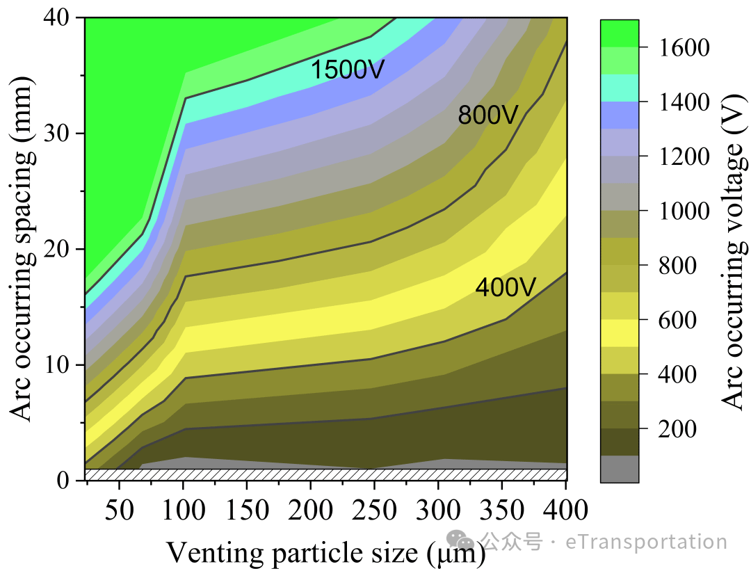 本文提出了关于喷发颗粒物诱导电弧的临界击穿电压-电气间距-颗粒物粒径三参数致灾边界图及构建方法,可用于指导电池系统电弧风险评估和防护设计。