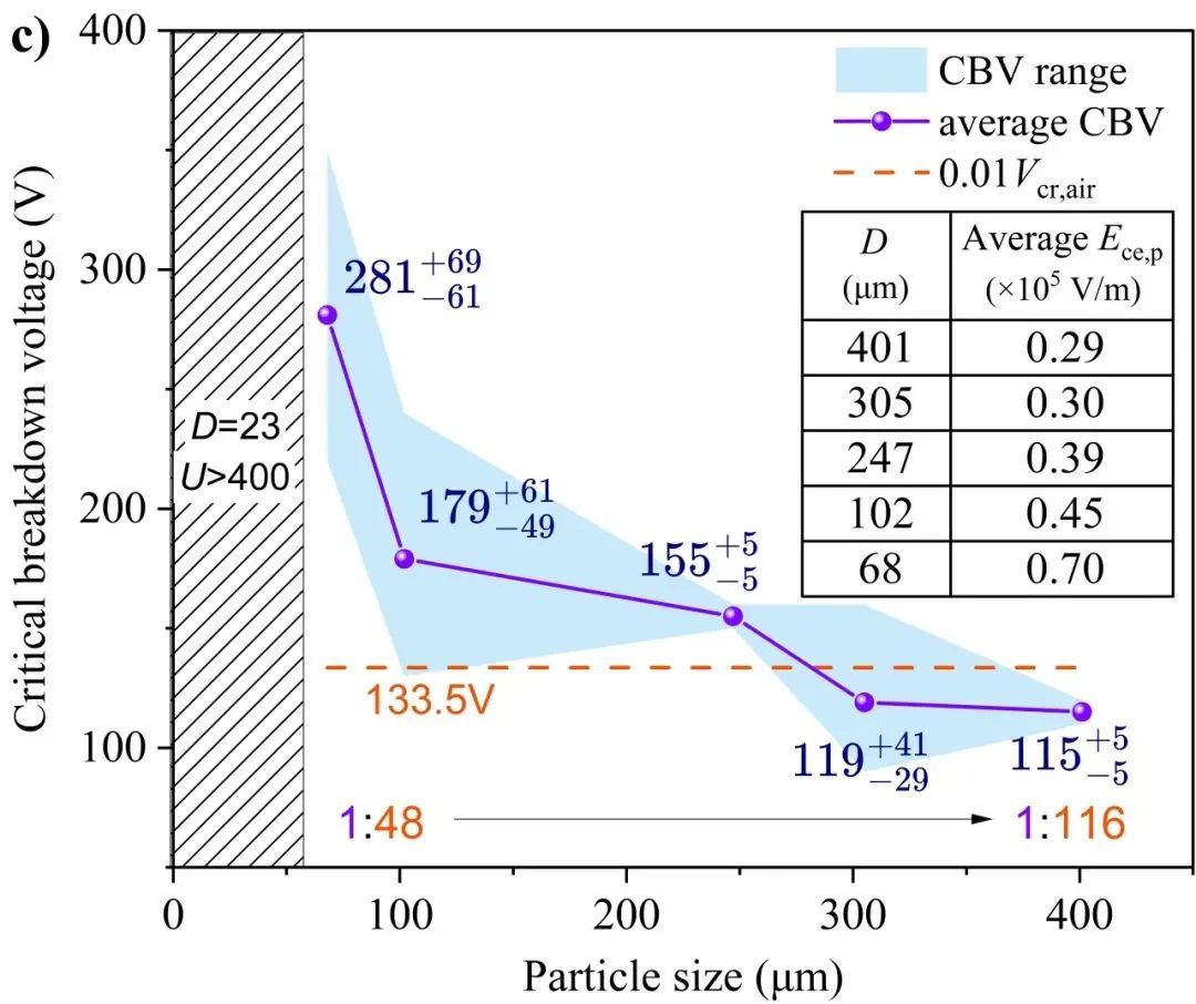 (2)颗粒物尺寸。由于不同颗粒物样品不仅尺寸存在差异,物质组成也有区别,因此本文所指“颗粒物尺寸”因素实际也包含了粒径相关的其它理化特性参数。电气间距固定为4mm,负载电阻为20Ω,颗粒物选择样品a~f。随着颗粒物尺寸降低,临界击穿电压显著增加,平均击穿电场强度由0.29kV/cm增长到0.70kV/cm,如图7c。对于样品f,外加电压达到400V仍未击穿颗粒物介质。这说明捕集大粒径颗粒物(如粒径超过100μm)可以显著降低喷发颗粒物诱导电弧发生的可能性。相较于均匀电场下空气介质的临界击穿电压,各组颗粒物介质在本文电极模型下的临界击穿电压值仅约为0.9~2.1%。