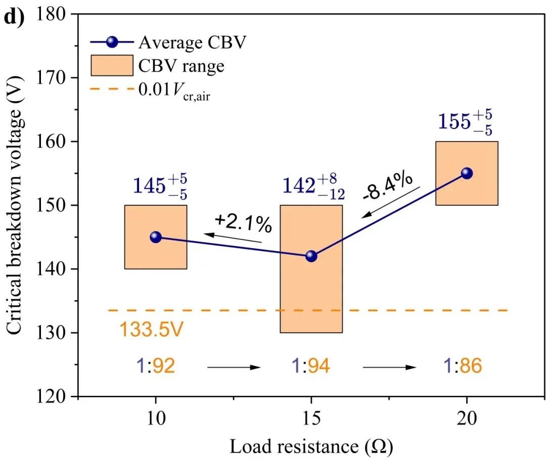 图7 喷发颗粒物诱导电弧临界击穿电压的影响因素。a)和 b)电气间距; c)颗粒物尺寸;d)负载阻值。