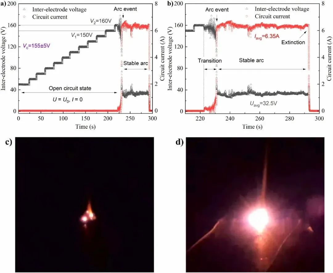 以一个典型测试案例说明喷发颗粒物对击穿电弧形成的促进作用。对应图3a电弧测试系统,电气间距设为4mm,颗粒物选择样品a,负载电阻为20Ω。电极间隙间未放置颗粒物时,即使外部电压加载到400V仍没有出现放电现象;然而放置颗粒物后,电弧测试曲线如图6a所示。当外加电压不超过V1(150V)时,回路电流接近于0,此时串联回路可认为是开路状态,电极两端电压值近似为外加电源电压;直到外加电压达到V2(160V)时,发生击穿电弧现象(如图6d),回路电流显著增加,且逐渐趋于稳定,此时电极两端电压为电弧电压。在该情形下,电弧临界击穿电压参考值为155±5V,说明喷发颗粒物能显著降低击穿电弧形成所需最小电压。在稳定燃弧阶段(图6b),可以计算平均电弧电流、平均电弧电压和平均电弧电阻,以表征电弧的电特性,同时以平均电弧功率代表电弧的热特性。事实上,对于小电气间距或大尺寸颗粒物,击穿电弧形成前就可能出现不稳定的0.01A量级的局部放电现象,如图6c。