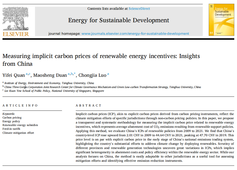 Yifei Quan, Maosheng Duan & Chongjia Luo (2025). Measuring Implicit Carbon Prices of Renewable Energy Incentives: Insights from China. Energy for Sustainable Development, 85: 101656. //doi.org/10.1016/j.esd.2025.101656