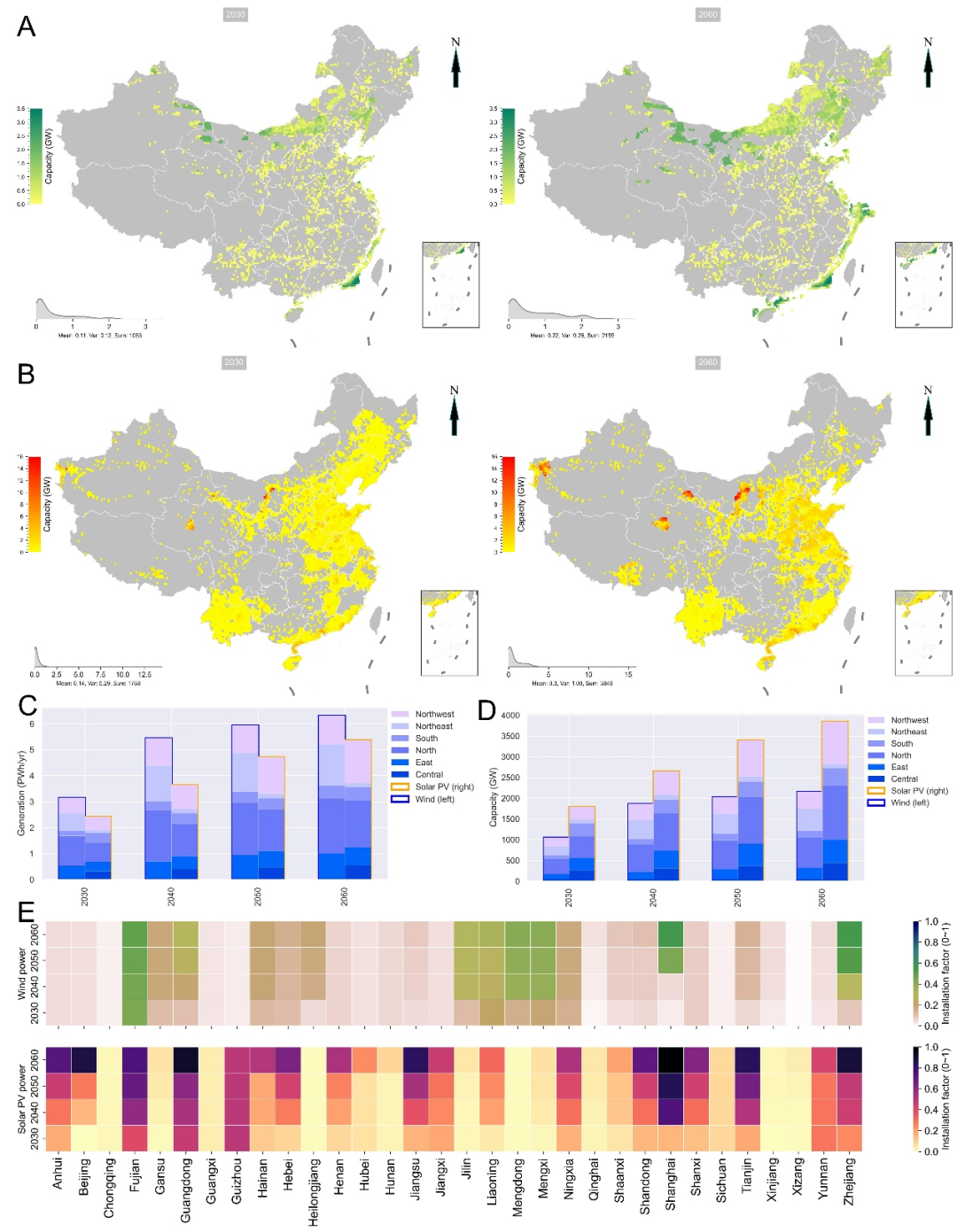 图4:面向2060的可再生能源部署情况。(A)格点级风电装机;(B)格点级光伏装机;(C)分电网区域风电光伏发电量;(D)分电网区域风电光伏装机量;(E)各省风电光伏的装机容量与技术建设潜力的比值